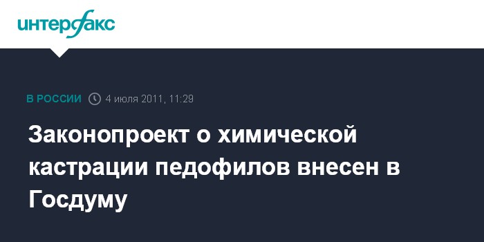 Москва. 4 июля. INTERFAX.RU - В Госдуму внесен законопроект, устанавливающий порядок химической кастрации педофилов.