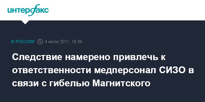 "Недостатки оказания Магнитскому медицинской помощи находятся в прямой причинно-следственной связи с наступлением его смерти. В ближайшее время следствие в соответствии с действующим уголовно-процессуальным законодательством планирует привлечь к уголовной ответственности лиц, допустивших выявленные нарушения", - сказал Маркин "Интерфаксу" в понедельник.