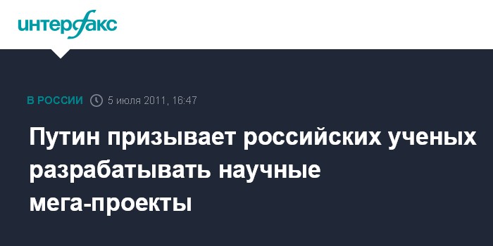 Дубна. 5 июля. INTERFAX.RU - В России созданы все условия для начала реализации научных мега-проектов мирового уровня, сопоставимых с уже реализованными в нашей стране "космической" и "ядерной" программами, заявил премьер РФ Владимир Путин.