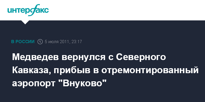 Москва. 5 июля. ИНТЕРФАКС - Президент России Дмитрий Медведев завершил рабочую поездку по Северо-Кавказскому федеральному округу и вернулся в Москву.