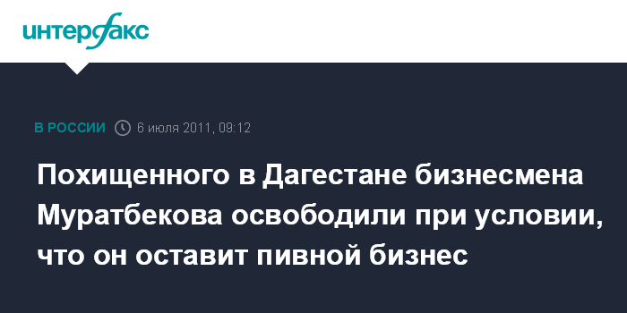 Махачкала. 6 июля. INTERFAX.RU - Похищенный 25 июня в Хасавюрте руководитель торговой компании ООО "Пиво-маркет" Муратбек Муратбеков освобожден похитителями на условиях прекращения бизнеса, сообщил "Интерфаксу" источник в правоохранительных органах республики.