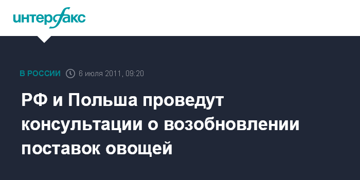Москва. 6 июля. INTERFAX.RU - Российская санитарная служба решила пока не давать "зеленый свет" поставкам свежих овощей из Польши на рынок РФ, по этой проблеме состоятся двусторонние консультации.