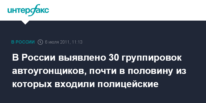 Москва. 6 июля. INTERFAX.RU - Сотрудники главного управления собственной безопасности МВД РФ в ходе масштабной спецоперации выявили три десятка объединенных преступных группировок, занимавшихся угонами автомобилей, почти в половину из которых входили полицейские.