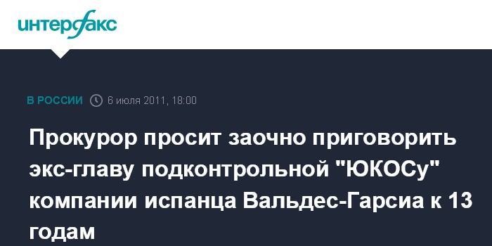 Прокурор просит заочно приговорить экс-главу подконтрольной "ЮКОСу" компании испанца Вальдес-Гарсиа к 13 годам