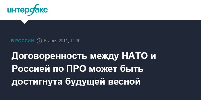 Брюссель. 6 июля. INTERFAX.RU - Договоренность по ПРО между НАТО и Россией может быть достигнута к весеннему саммиту НАТО 2012 года, заявил генеральный секретарь НАТО Андерс Фог Расмуссен.