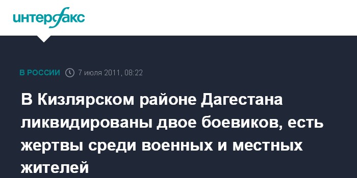 Махачкала. 7 июля. INTERFAX.RU - По предварительным данным, двое боевиков убиты в ночном боестолкновении в Кизлярском районе Дагестана. Погиб сотрудник Внутренних войск и двое мирных жителей, сообщил "Интерфаксу" представитель следственного управления СКР по Дагестану.