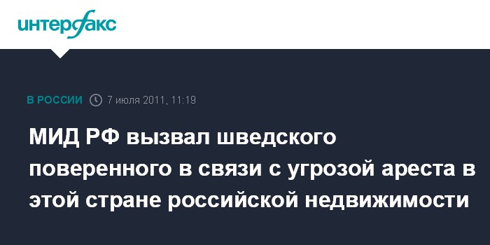 Москва.7 июля. INTERFAX.RU - Временный поверенный в делах Швеции в Москве Мартин Оберг был в среду вызван в МИД РФ в связи с опубликованным на днях решением Верховного суда Швеции, согласно которому дипломатическая недвижимость России в этой стране может попасть под арест и быть продана с молотка, заявили в МИД РФ.