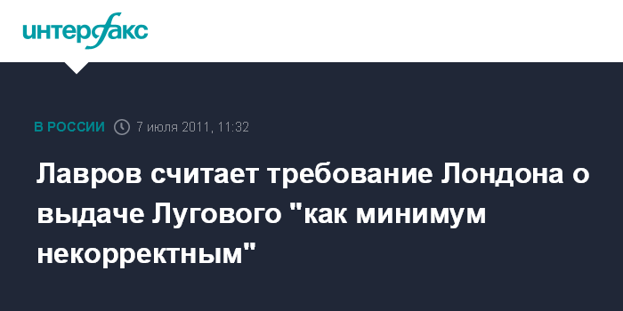 Москва. 7 июля. INTERFAX.RU - Глава МИД РФ Сергей Лавров расценивает как некорректное требование Великобритании к России выдать Андрея Лугового.