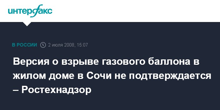 Москва. 2 июля. INTERFAX.RU - Специалисты Северо-Кавказского межрегионального управления Ростехнадзора исследовали газовый баллон, найденный в сочинском доме, где произошел взрыв, сообщил агентству "Интерфакс-Юг" официальный представитель Северо-Кавказского межрегионального управления Ростехнадзора Роман Соколовский. "Газовый баллон был вынесен на поверхность целым", - подчеркнул собеседник агентства.