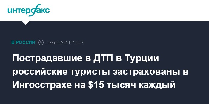 Москва. 7 июля. INTERFAX.RU - Пострадавшие в ДТП в Турции российские туристы застрахованы в "Ингосстрахе" по стандартному полису выезжающих за рубеж на $15 тыс. каждый, сообщил агентству "Интерфакс-АФИ" руководитель службы по связям с общественностью "Ингосстраха" Владимир Клейменов.