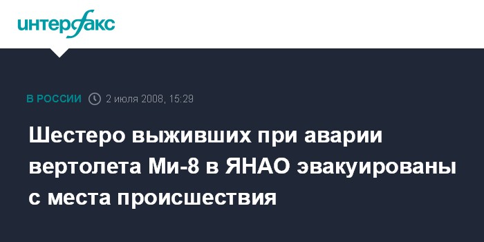 Москва. 2 июля. INTERFAX.RU - Шестеро выживших при аварии вертолета Ми-8 в ЯНАО доставлены в город Ноябрьск, сообщили в МЧС России.