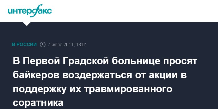 Москва. 7 июля. INTERFAX.RU - Главный врач Первой Градской больницы Москвы Алексей Шабунин призвал сообщество мотоциклистов не проводить массовую акцию возле учреждения в поддержку их товарища Рауфа Абзалова, травмированного в начале июня спорткаром.