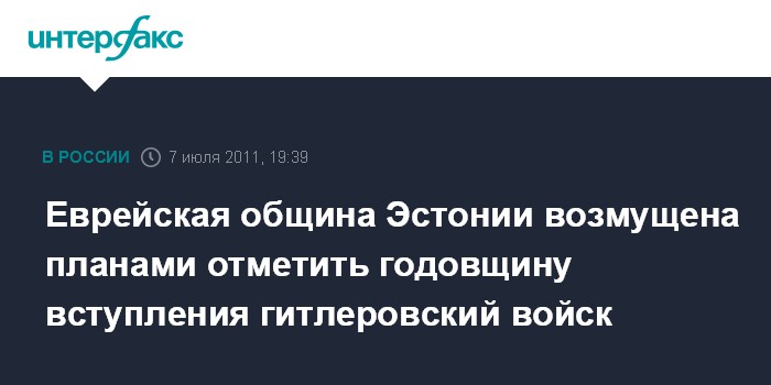 Таллин. 7 июля. INTERFAX.RU - Еврейская община Эстонии выразила недоумение и возмущение в связи с планами провести в пятницу в эстонском городе Вильянди (Viljandi) памятное мероприятие, посвященное 70-летию вступления в город войск нацистской Германии в 1941 году.