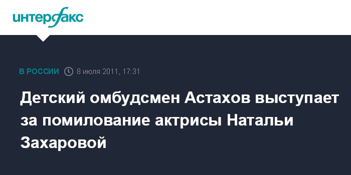 Москва. 8 июля. INTERFAX.RU - Уполномоченный при президенте РФ по правам ребенка Павел Астахов обратился к главе государства Дмитрию Медведеву с просьбой поддержать ходатайство об освобождении актрисы Натальи Захаровой, осужденной за поджог квартиры бывшего мужа и дочери.