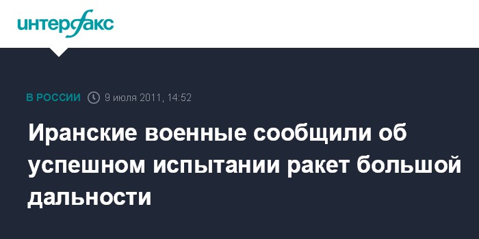 Тегеран. 9 июля. INTERFAX.RU - Иранская армия провела еще в начале 2011 года испытания ракет большой дальности, способных поражать мишени на расстоянии до 1, 9 тыс. километров, объявил в субботу бригадный генерал Корпуса стражей Исламской революции Амир-Али Хаджизаде. По его словам, зимой в центральной части Ирана был произведен пуск двух таких ракет. Обе они поразили мишени в Индийском океане.