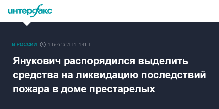 Киев. 10 июля. INTERFAX.RU - Украинское правительство выделит средства для ликвидации последствий чрезвычайной ситуации в доме престарелых в Ровенской области. Как говорится в сообщении, размещенном на сайте Кабинета министров в воскресенье, средства будут выделены во исполнение поручения президента Украины Виктора Януковича из резервного фонда государственного бюджета.