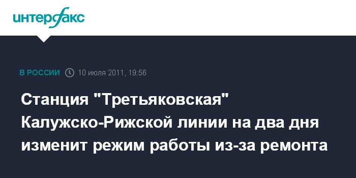 Москва. 10 июля. ИНТЕРФАКС-МОСКВА - Режим работы станции "Третьяковская" Калужско-Рижской линии московского метро будет изменен 16 и 17 июля.
