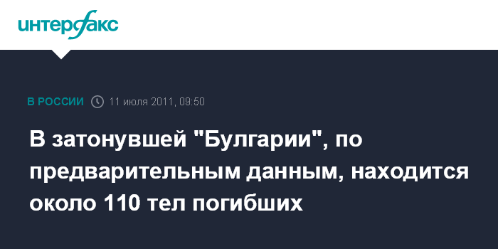 Ижевск. 11 июля. INTERFAX.RU - Около тел 110 погибших, в том числе 30 детей, по предварительным данным, находятся внутри затонувшего на Волге в Татарстане теплохода "Булгария", сообщила в понедельник пресс-служба поисково-спасательной службы Удмуртии, чьи спасатели также проводят работы на месте крушения.