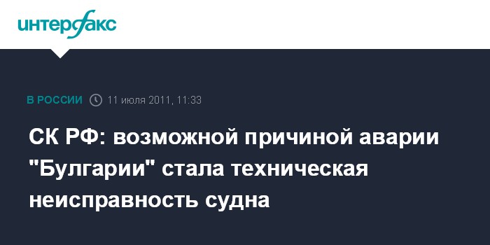 Москва. 11 июля. INTERFAX.RU - Теплоход "Булгария" накренился еще при выходе из порта в Казани, возможно, из-за технической неисправности судна, считают в Следственном комитете РФ.
