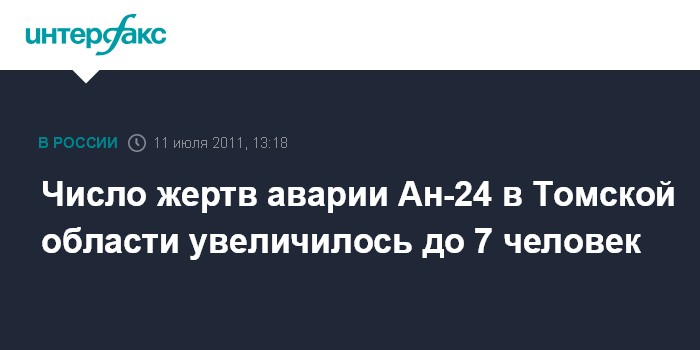Томск.11 июля. INTERFAX.RU - Количество жертв аварии самолета Ан-24, совершившего аварийное приводнение на реке Обь в Томской области, увеличилось до семи, сообщила агентству "Интерфакс-Сибирь" начальник отдела безопасности проживания и гражданской обороны городской администрации Стрежевого Ярослава Карпенко.