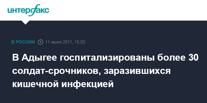 Майкоп. 11 июля. INTERFAX.RU - Свыше 30 военнослужащих срочной службы госпитализированы в Майкопский военный госпиталь с признаками инфекционного заболевания, сообщили агентству "Интерфакс-Юг" в администрации военного госпиталя.
