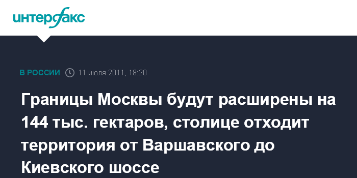 Границы Москвы будут расширены на 144 тыс. гектаров, столице отходит территория от Варшавского до Киевского шоссе