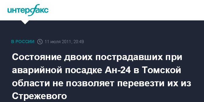 Томск. 11 июля. INTERFAX.RU - Двое пассажиров, получивших тяжелые травмы в результате вынужденной посадки самолета Ан-24 на Обь в Томской области, пока останутся в городе Стрежевом, сообщила агентству "Интерфакс-Сибирь" главный врач городской больницы Людмила Виноградова в понедельник.