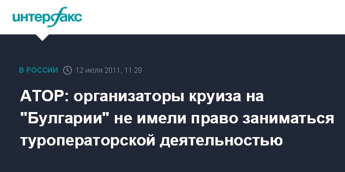 Москва. 12 июля. INTERFAX.RU - Компания "АргоРечТур", арендовавшая теплоход у Камского речного пароходства, а также агентство "Интур-Волга", продававшие круиз выходного дня на "Булгарии", не имели права заниматься туроператорской деятельностью, говорится в сообщении Ассоциации туроператоров России (АТОР).