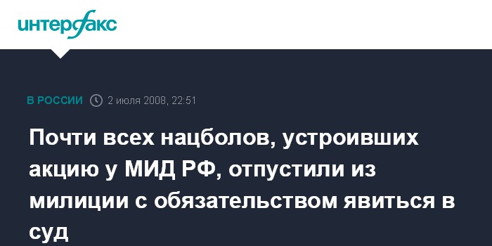 Москва. 2 июля. ИНТЕРФАКС-МОСКВА - Одиннадцать из 12 нацболов, задержанных в среду во время несанкционированной акции протеста у приемной МИД РФ, отпущены на свободу, сообщил "Интерфаксу" начальник управления информации и общественных связей ГУВД по Москве Виктор Бирюков.