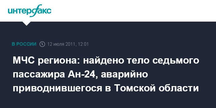 Томск. 12 июля. INTERFAX.RU - Спасатели обнаружили тело седьмого - последнего - пассажира самолета Ан-24, совершившего аварийную посадку на Обь в Томской области, сообщили агентству "Интерфакс-Сибирь" в пресс-службе МЧС по региону во вторник.