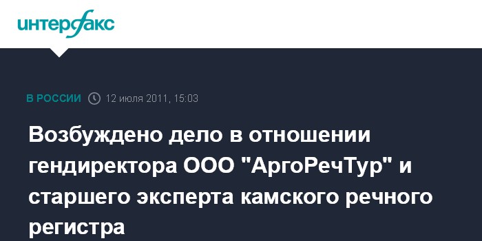 Москва. 12 июля. INTERFAX.RU - Уголовное дело по статье об оказании услуг, не отвечающих требованиям безопасности, возбуждено в отношении гендиректора ООО "АргоРечТур" и старшего эксперта Камского филиала российского речного регистра, сообщил "Интерфаксу" во вторник официальный представитель СК РФ Владимир Маркин.