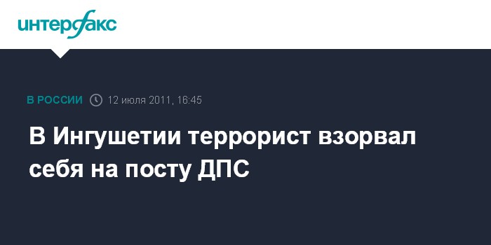Назрань. 12 июля. INTERFAX.RU - В селении Галашки Сунженского района Ингушетии у поста ДПС террорист-смертник произвел самоподрыв.