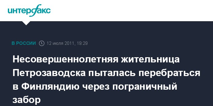 Петрозаводск. 12 июля. INTERFAX.RU - В Сортавальском районе Карелии пограничный наряд задержал 16-летнюю жительницу Петрозаводска, которая пыталась попасть в Финляндию, сообщили "Интерфаксу" в республиканском управлении погранслужбы.