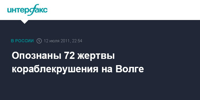 Нижний Новгород. 12 июля. ИНТЕРФАКС-ПОВОЛЖЬЕ - По данным на 22:10 мск опознано 72 человека, погибших в результате крушения "Булгарии", сообщает Минздрав республики Татарстан.