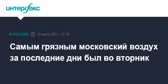 Москва. 13 июля. INTERFAX.RU - В течение последних пяти дней вторник оказался самым неблагоприятным с точки зрения чистоты столичного воздуха, несмотря на то, что метеоусловия способствовали его очищению от вредных примесей, заявляют в ГПУ "Мосэкомониторинг".