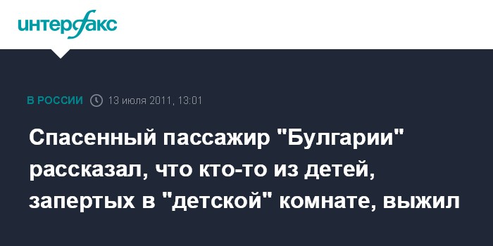Казань. 13 июля. INTERFAX.RU - Один из спасенных пассажиров с теплохода "Булгария" рассказал журналистам, что один из мальчиков, уцелевших после катастрофы в Куйбышевском водохранилище, мог находиться перед аварией в "детской" комнате.