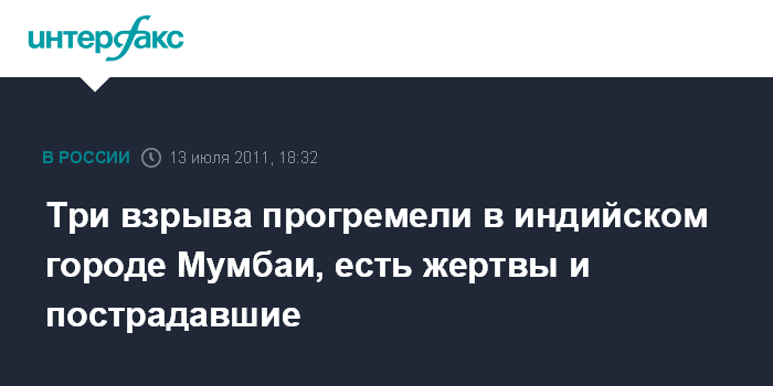 Дели. 13 июля. INTERFAX.RU - Не менее четырех человек погибли в среду в результате трех взрывов в индийском городе Мумбаи (Бомбее), передает индийский телеканал NDTV.