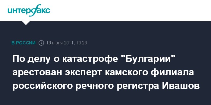 Москва. 13 июля. INTERFAX.RU - Суд в Казани принял решение о заключении под стражу старшего эксперта камского филиала российского речного регистра Якова Ивашова, который проходит по делу о катастрофе теплохода "Булгария", сообщил "Интерфаксу" официальный представитель СК РФ Владимир Маркин.