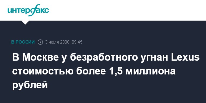 "В среду в милицию обратился неработающий 32-летний москвич. Мужчина заявил, что неизвестные от дома N16 по улице Генерала Курина похитили его автомобиль "Lexus JC-300" стоимостью 1 млн 515 тыс. рублей", - рассказал собеседник агентства.