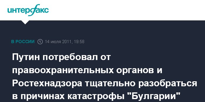 Казань. 14 июля. INTERFAX.RU- Премьер-министр РФ Владимир Путин заявляет о необходимости тщательного расследования правоохранительными органами и Ростехнадзором обстоятельств трагедии с теплоходом "Булгария".