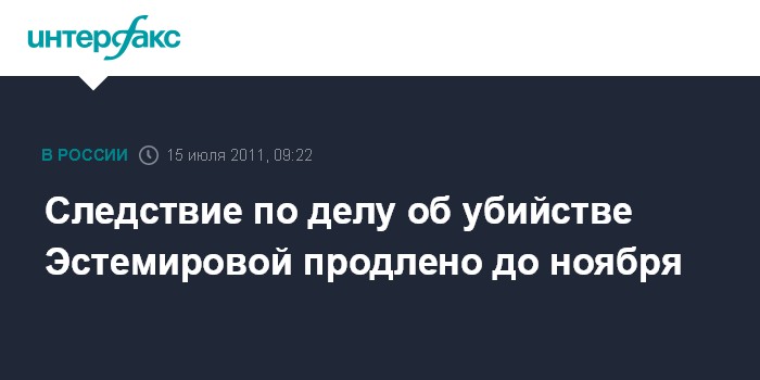 Москва. 15 июля. INTERFAX.RU - Срок расследования уголовного дела о похищении и убийстве правозащитницы Натальи Эстемировой продлен до 15 ноября 2011 года, сообщил официальный представитель СК РФ Владимир Маркин.
