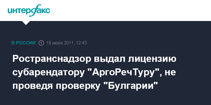 Москва. 15 июля. INTERFAX.RU - Управление "Ространснадзора" вынесло положительное решение по обращению субарендатора "Булгарии" "АргоРечТур" за лицензией на право пассажирских перевозок без проверки организации и судна.