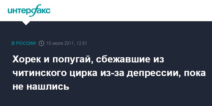 Чита. 15 июля. INTERFAX.RU - Сотрудники читинского цирка "Шапито" продолжают искать попугая и хорька, сбежавших от депрессии, вызванной затяжными дождями.