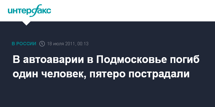 Москва. 18 июля. ИНТЕРФАКС - Один человек погиб, еще пятеро пострадали в результате ДТП на Минском шоссе в Московской области, сообщил "Интерфаксу" источник в правоохранительных органах