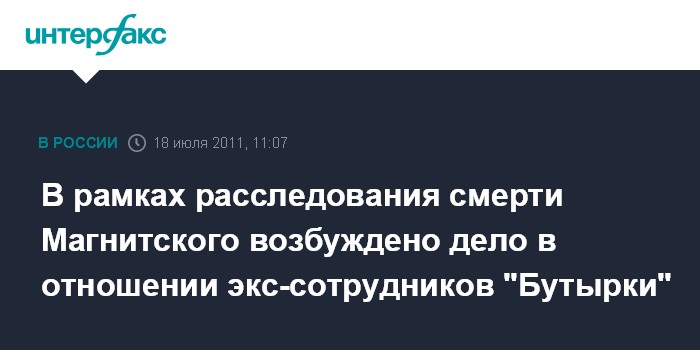Москва. 18 июля. ИНТЕРФАКС - Следственный комитет России возбудил уголовное дело в отношении бывших сотрудников СИЗО №2 "Бутырка" в рамках расследования смерти сотрудника Фонда "Хермитедж" Сергея Магнитского, сообщил "Интерфаксу" официальный представитель СК РФ Владимир Маркин.