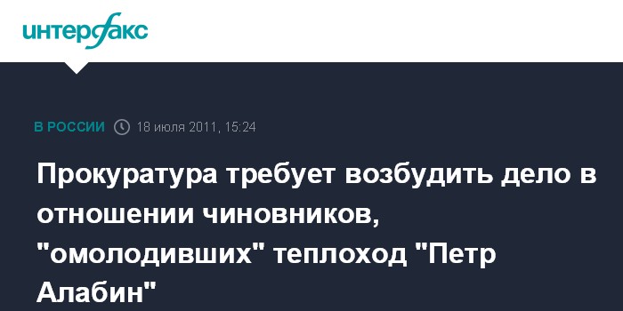 Москва.18 июля. INTERFAX.RU - Татарская транспортная прокуратура пробует возбудить еще одно уголовное дело в связи с нарушениями на теплоходе "Петр Алабин" - близнеца затонувшей "Булгарии".