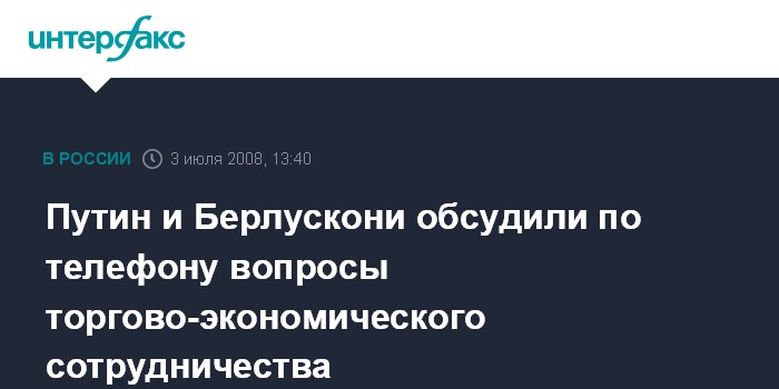 Москва. 3 июля. INTERFAX.RU – Председатель правительства РФ Владимир Путин в четверг провел телефонный разговор с премьером Италии Сильвио Берлускони.