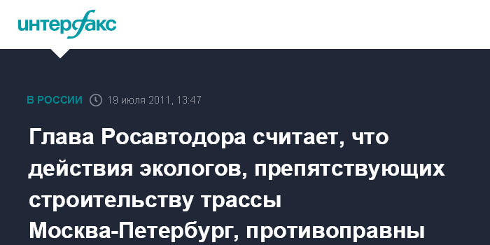 "Их (экологов - ИФ) демарши могут привести к затруднениям при строительстве дороги. Однако трасса Москва - Санкт-Петербург строится. В мае мы передали все полномочия по строительству дороги компании "Автодор". Работы идут в графике", - отметил он.