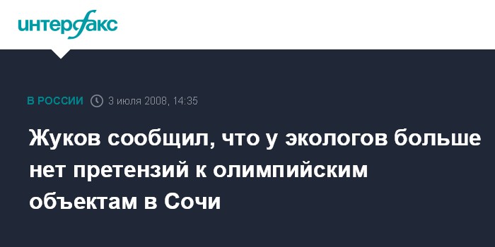 Москва. 3 июля. INTERFAX.RU - Вице-премьер правительства РФ Александр Жуков заявил, что у экологических организаций больше нет претензий к объектам зимней Олимпиады-2014 в Сочи. "Сегодня ими (экологами - ИФ) было заявлено, что все остальные объекты (кроме санно-бобслейной трассы, горной олимпийской деревни и водозабора - ИФ) и весь план Олимпиады полностью удовлетворяют экологов", - сказал он на пресс-конференции в Сочи.