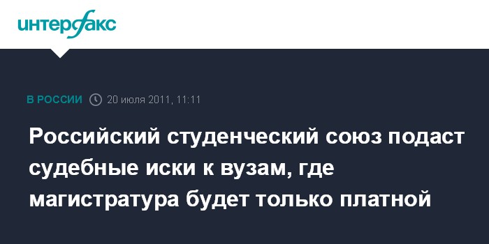 Москва. 20 июля. INTERFAX.RU - Российский студенческий союз (РСС) будет судиться с учебными заведениями, предоставляющими возможность обучаться в магистратуре только на платной основе.